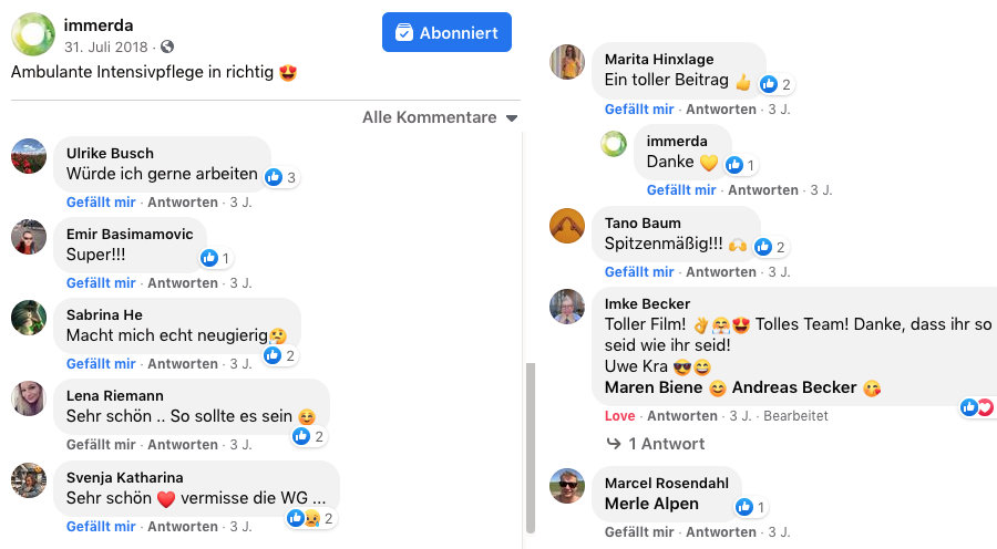 Für die Firma Immerda, durften wir einen modernen Employer Branding Film produzieren, der bei Personal, Krankenkassen und Angehörigen, besonders positiv aufgefallen ist. Erfreulicher Weise lies sich das Unternehmen überzeugen, dass ein Employer Branding Film mehr Informationen bieten sollte als ein “Imagefilm”:reaxo://118. Obwohl die Geschäftsführerin zunächst wenig begeistert war, selbst vor die Kamera zu müssen, konnte ich ihr in wenigen Minuten alle Bedenken nehmen. Das Ergebnis… sehen Sie selbst!
